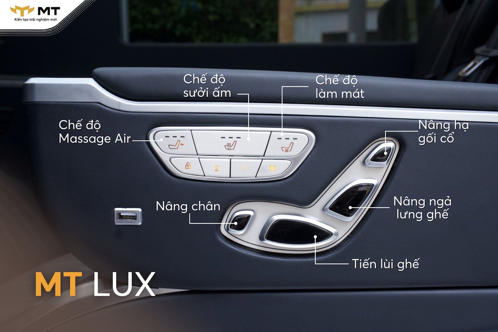 Hệ thống tiện ích cá nhân hóa tại từng ghế với massage, sưởi ấm, làm mát và chỉnh điện linh hoạt, kết hợp sạc USB/Type-C cùng giải trí và kết nối đầy đủ, mang đến trải nghiệm tiện nghi xuyên suốt hành trình.