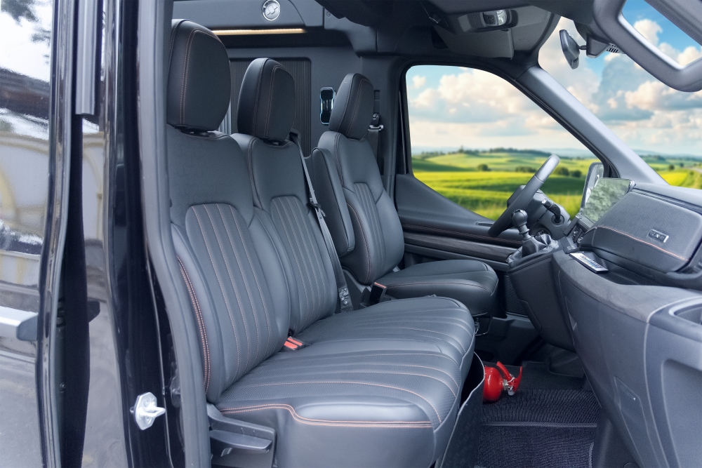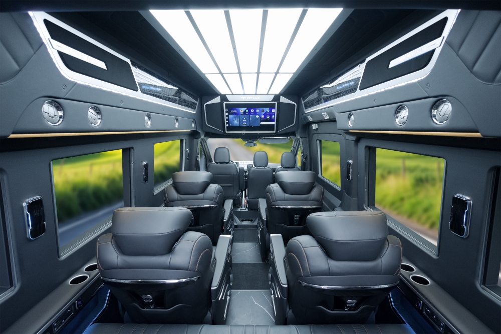Hai ghế đầu khoang khách có khả năng xoay 180 độ, tạo nên không gian tương tác linh hoạt, riêng tư và sang trọng, lý tưởng cho các hành trình đón tiếp khách VIP hoặc phục vụ nhu cầu cá nhân hóa trải nghiệm